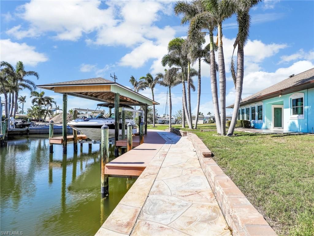 Welcome to your dream waterfront retreat! This bright and airy 3-bedroom, 2.5-bathroom home is nestled at the end of a serene canal and features a private boat dock with a lift, offering direct access to the water for boating, fishing, and outdoor recreation. With tons of natural light streaming through large windows, every room feels warm and inviting, creating a perfect setting for both relaxation and entertainment. This open concept home features sleek, easy-to-care-for tile flooring throughout making it both stylish and easy to maintain, perfect for a laid-back waterfront lifestyle. The spacious kitchen is a chef's dream, featuring granite countertops, updated appliances, a breakfast island, and ample cabinet space. Enjoy the split bedroom floor plan offering privacy and comfort with the master suite on one side of the home, and the guest bedrooms on the other